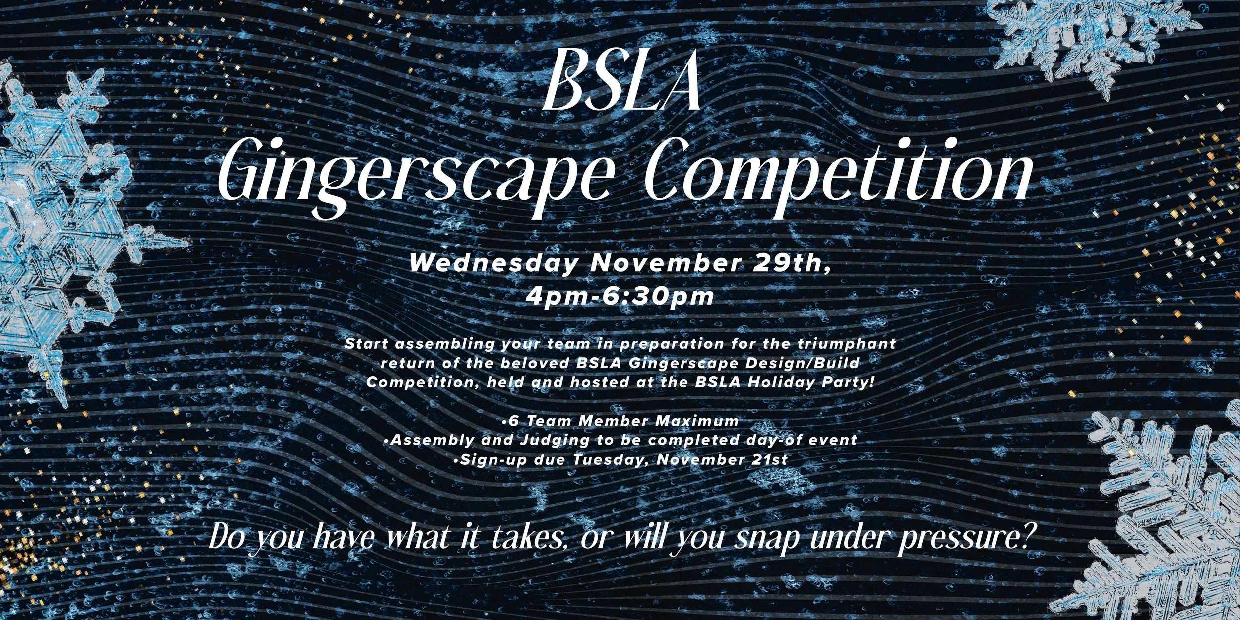 In addition, this year's holiday party includes the triumphant return of the beloved BSLA "Gingerscape" design/build competition!