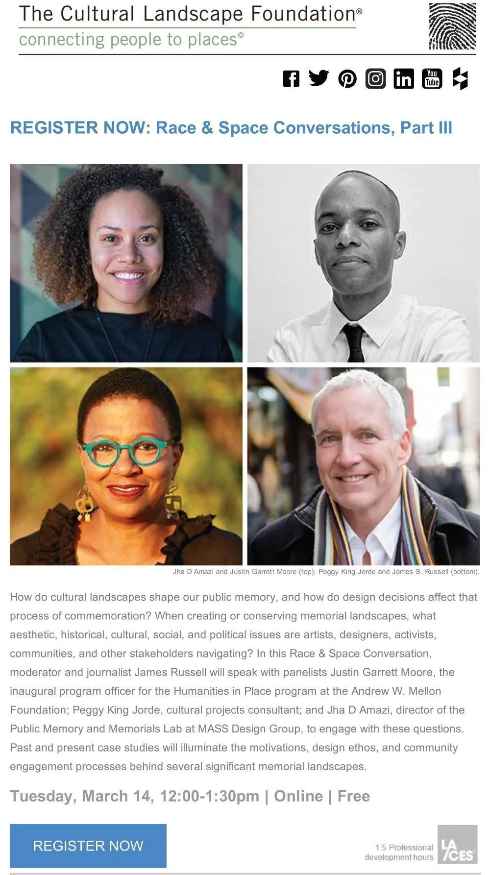 TCLF: Race + Space Conversation, Part III Tuesday, March 14, 2023 12:00 PM 1:30 PM Google Calendar ICS Online. Free.Click here to register.