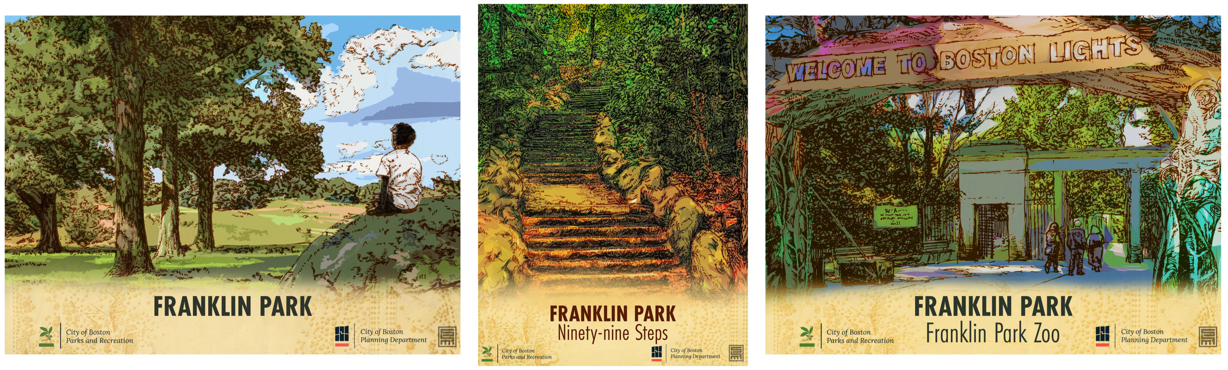 Jury Selection and People’s Choice entries must include a series of three posters, designed as a “visual family”, featuring physical and/or cultural icons associated with Franklin Park, including: